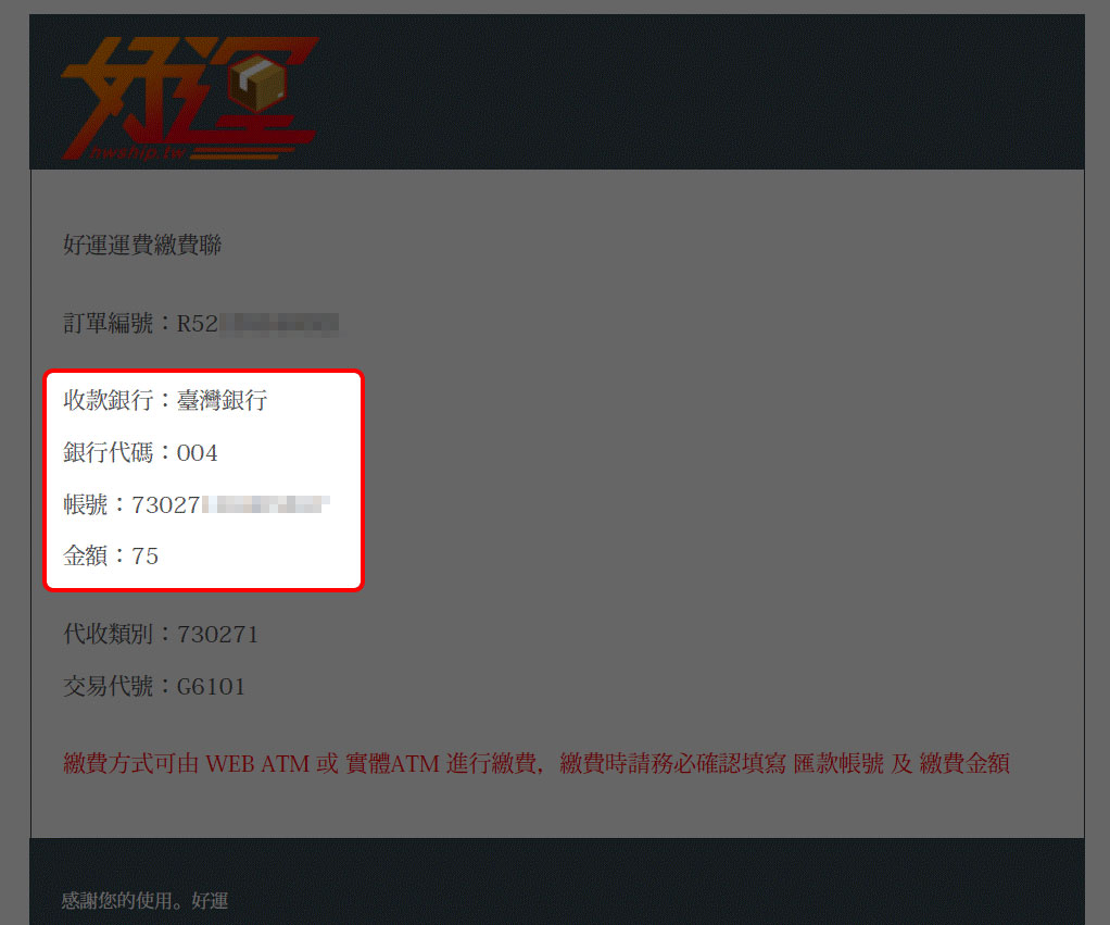 依照繳費單資訊進行付款。※請務必留意匯款帳號及金額,匯款帳號限單次使用。